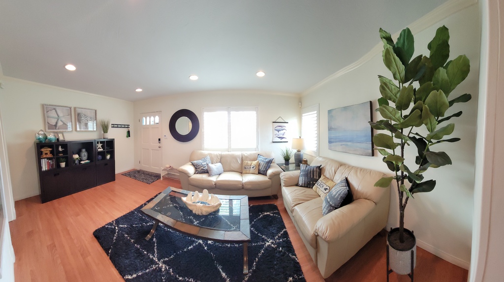 The house is a 3 bedroom, 1 and half bath charming cottage, fully stocked kitchen, a family room and living room. There is a fenced backyard in the back with an outdoor kitchen and dining area along with a sun deck.