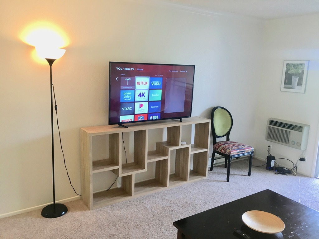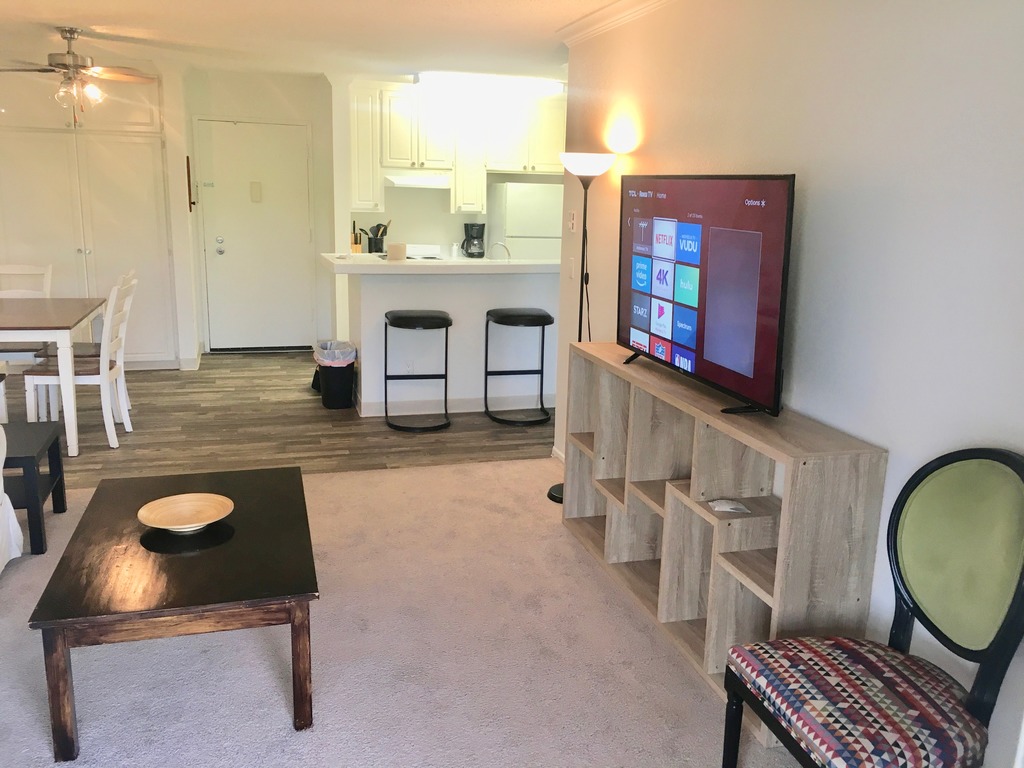 Full access to the wonderful amenities including fast WiFi, 1 parking, convenient laundry rooms, a great heated pool and two large hot tubs, gym, tennis courts, business center, movie room and more! Pet-friendly or pet-free options. One bedroom, one bath, queen size bed, on the 3rd floor. All of our furnished unis are comfortable, that is perfect for visiting executives, professors, students, vacationing couples or small families. And WE ALLOW PETS! We also have non pet units for those with pet allergies. There is a queen size bed in the bedroom and a fold out sofa in the living room so can accommodate up to 4 people. There is an amazing grounds with pools, hot tubs, a gym, lounge, movie room, tennis and basketball courts. |